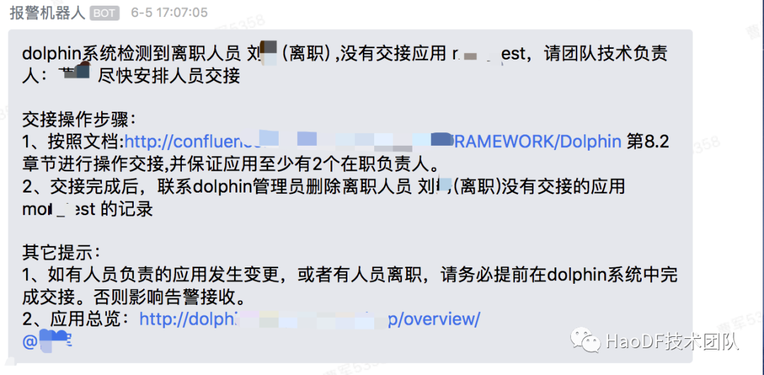 - 通讯录、权限和内部hr、OPS系统打通,随时感知人员入、离职状态,提醒技术负责人进行人员变更:
