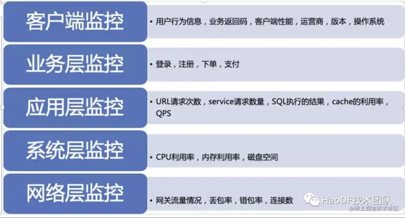 **应用层监控:**相关的技术参数,例如:URL 请求次数,Service 请求数量,SQL 执行的结果,Cache 的利用率,QPS 等等;