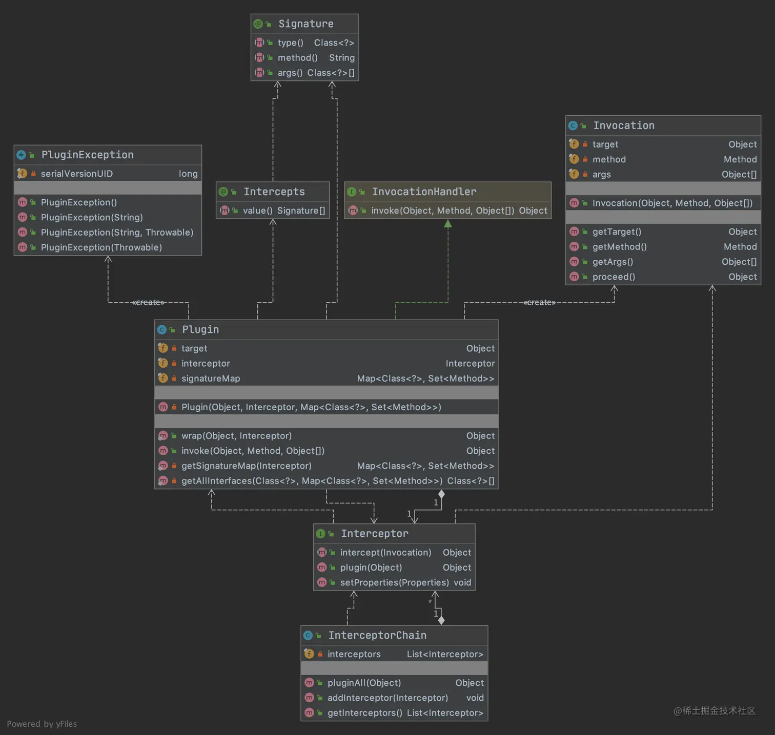 Signature、Intercepts定义了拦截注解的标志,那mybatis是如何实现拦截的呢?咱们接着往下看。