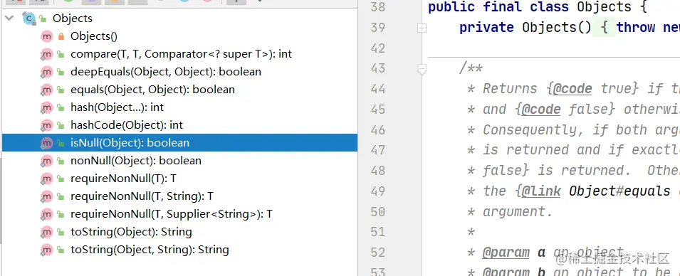 我们可以看到Objects类是Final的,即不可以被其他类继承,并且它里面的方法都是static的。说明这是一个工具类