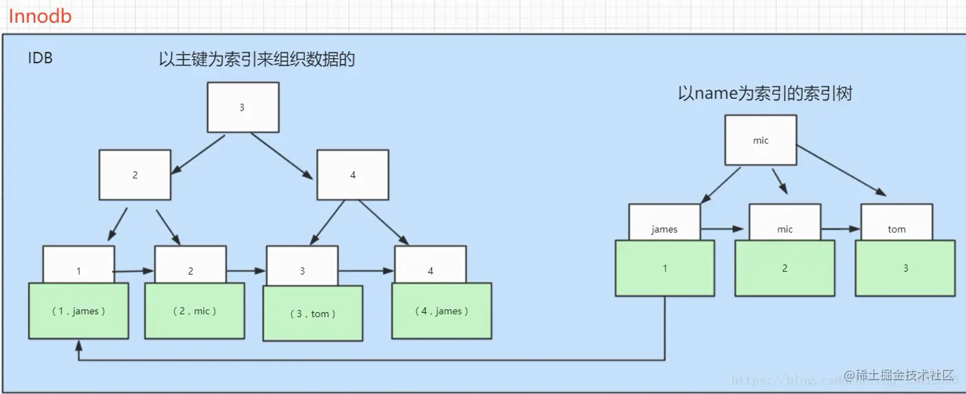 3. InnoDB是聚集索引,使用B+Tree作为索引结构,数据文件是和(主键)索引绑在一起的(表数据文件本身就是按B+Tree组织的一个索引结构),必须要有主键,通过主键索引效率很高。但是辅助索引需要两次查询,先查询到主键,然后再通过主键查询到数据。因此,主键不应该过大,因为主键太大,其他索引也都会很大。