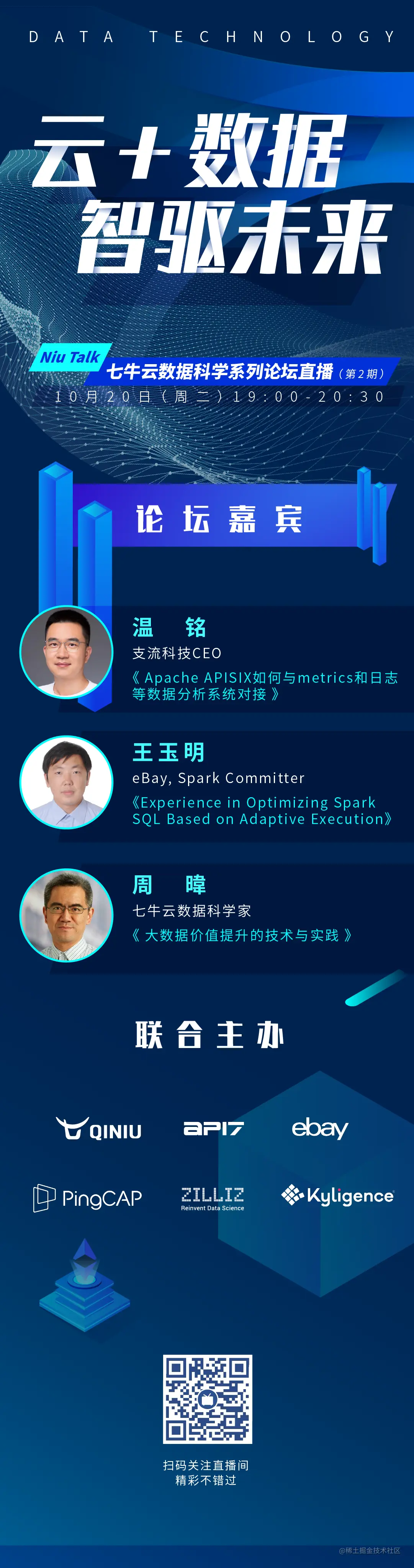 即将到来的第二期论坛直播,我们邀请 eBay 王玉明、支流科技温铭以及七牛云周暐三位嘉宾围绕《大数据价值提升的技术与实践》《Apache APISIX 如何与 metrics 和日志等数据分析系统对接》《Adaptive Query Execution : Speeding Up Spark SQL at Runtime》 三个主题深度探讨大数据分析,欢迎大家长期围观,锁定我们~