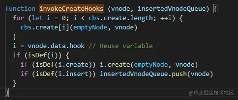 - 接着再调⽤ invokeCreateHooks ⽅法执⾏所有的 create 的钩⼦并把 vnode push 到insertedVnodeQueue 中。