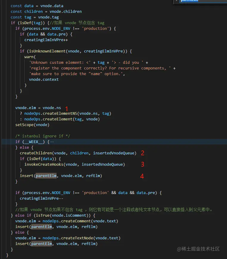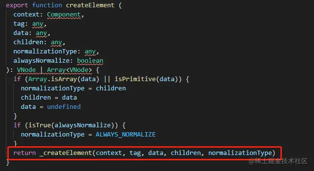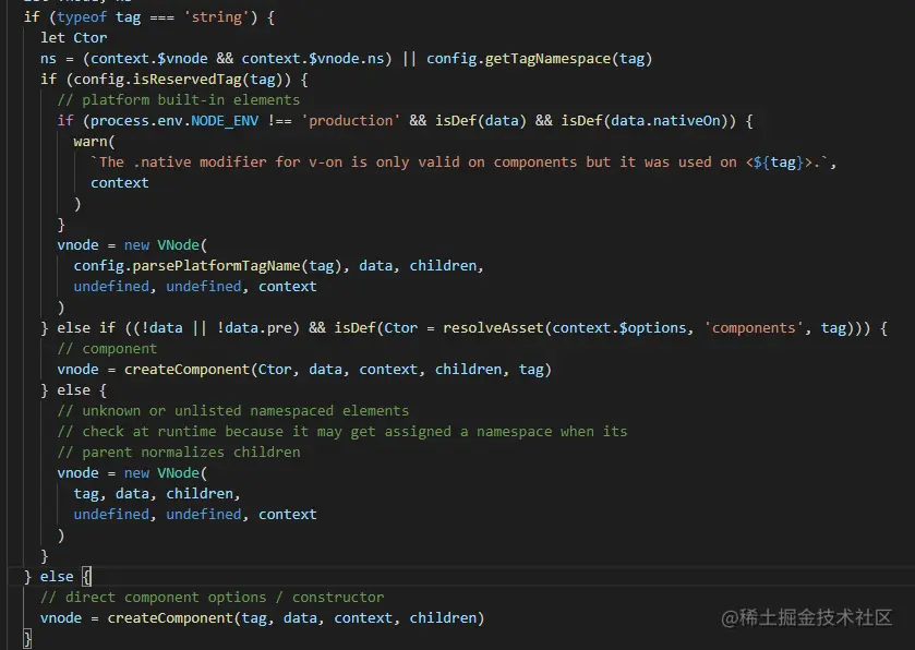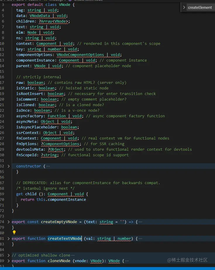 - VNode 的创建是通过之前提到的 createElement ⽅法创建的,我们接下来分析这部分的实现。