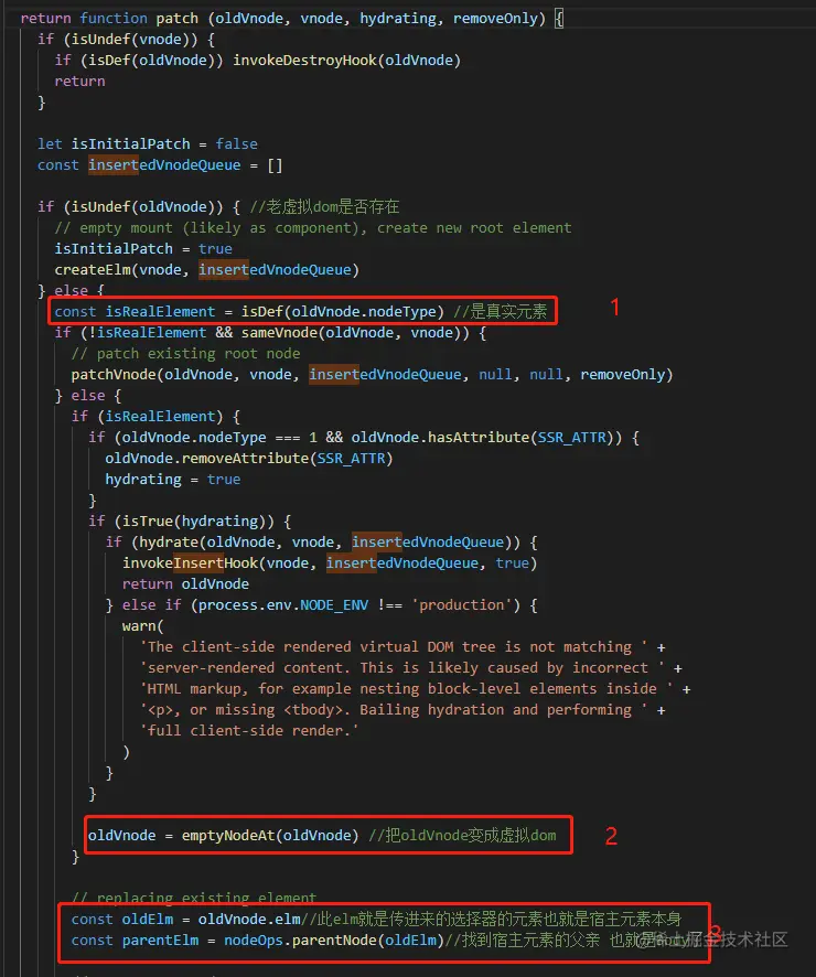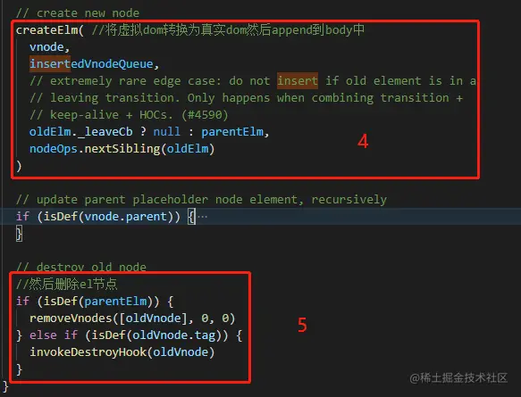 - 由于我们传⼊的 oldVnode 实际上是⼀个真实元素,所以 isRealElement 为 true,接下来⼜通过 emptyNodeAt ⽅法把 oldVnode 转换成 VNode 对象,调⽤ createElm ⽅法传入父节点body参数。