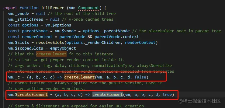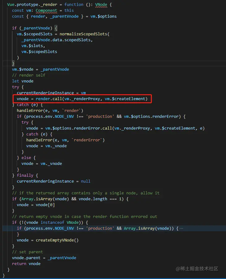 可以看到, render 函数中的 createElement ⽅法就是 vm.$createElement ⽅法。