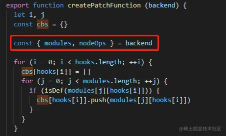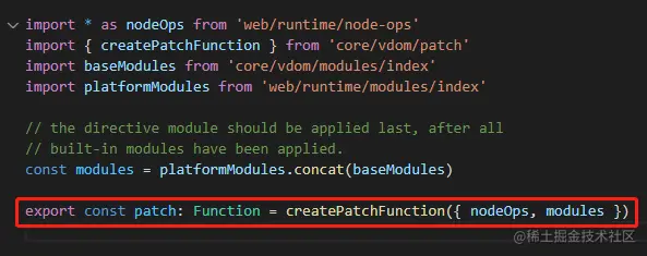 - 这⾥⽤到了⼀个函数柯⾥化的技巧,通过createPatchFunction 把差异化参数提前固化,这样不⽤每次调⽤ patch 的时候都传递nodeOps 和 modules 了,然后不同平台就拿到了不同的path函数。