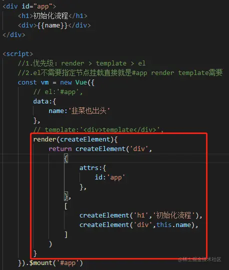 上面最关键的是 render ⽅法的调⽤,我们在平时的开发⼯作中⼿写 render ⽅法的场景⽐较少,⽽写的⽐较多的是 template 模板,在之前的 mounted ⽅法的实现中,会把 template 编译成 render ⽅法,然后我们获取到这个render方法然后进行调用。