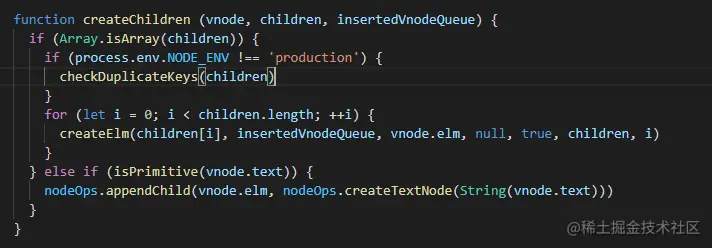 接下来调⽤ createChildren ⽅法去创建⼦元素,递归调⽤ createElm ,这是⼀种常见的深度优先的遍历算法。