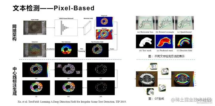 华中科技大学许老师提出一个TextField的概念,就是文字方向场的概念,传统基于分割的文字检测方法有一个很大的局限性就是对密集文本无法有效区分开。他们提出一个文字方向场,基于像素做回归,然后通过后处理组合成一个文字条,对于弯曲特别离谱的文字都可以检测出来。