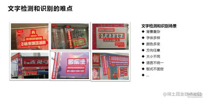 文字和检测和识别的难点也是非常多。从下面图片可以看得出,它的背景非常的复杂,字体不一、颜色多种多样、字体多种朝向、大小各不相同、语言不统一、模板不固定等应用场景,这些都是日常生活中所看到的。