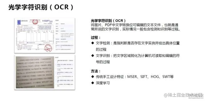 **光学字符识别,英文为OCR,是指把图片、PDF中的文字转换成可编辑的文字,也就是通常所说的文字识别。**如果只提光学字符识别,估计很多人不知道是什么意思,所以大家通常把光学字符识别说成为文字识别。实际光学字符识别是一般包括检测和识别等多个过程。文字检测,是指判断是否存在文字实例,并给出具体位置的过程。而文字识别是指把文字区域转化成计算机可读和编辑的符号。