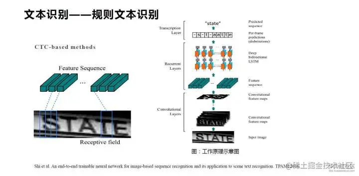在文字识别当中非常有代表性的一个方法是就是华中科技大学白老师团队提出的CRNN模型(后正式发表在IEEE TPAMI2016上),称之为 CRNN,其底层用 CNN 提取特征,中层用 LSTM 进行序列建模,上层用 CTC loss 对目标进行优化。它是一个端到端可训练的文字识别结构,但并未使用 Attention。目前,CRNN 已成长为该领域的一个标准方法。