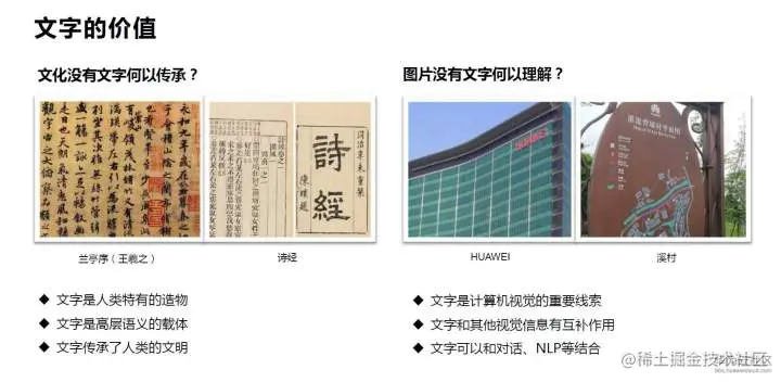 在上图的右侧的两幅图里面,可以看到是有建筑、有场景、有树木等。如果仅仅看到这两幅图,相信大家并不知道图片表达的意思。但是结合了文字之后,就可以一目了然的看到要讲的内容。所以说文字是计算机视觉的重要线索,与其他视觉信息有着重要的互补作用,可以和对话、NLP等,合成多模态语义分析。