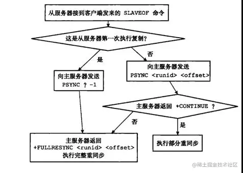 具体执行的方式是:从节点向主节点发送psync命令,开始同步。