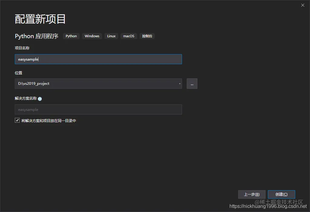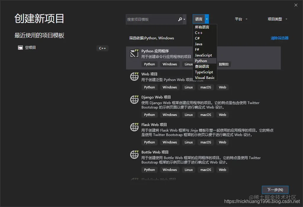 1.点击菜单栏-->文件-->新建-->项目,语言选择Python,选择Python应用程序,下一步