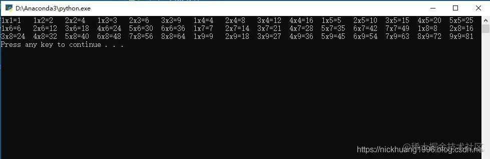 注意print里的{}是需要用.format来填充数据的,说白了就是第1个{}代表j,第2个{}代表i,第3个{}代表i乘以j。”if __name__ == '__main__':“意思是如果以这个文件为运行文件则执行里面的代码,例如这里就是执行JJCFB()的函数: