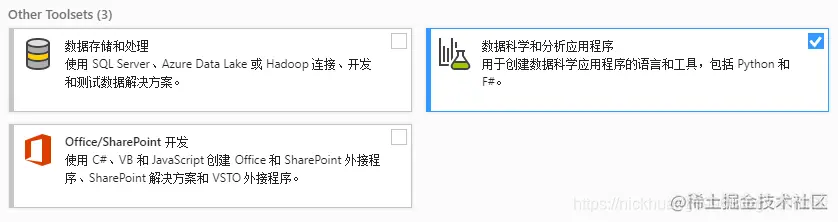 2.勾选“Python开发”和“数据科学和分析应用程序”,点击“下载时安装”