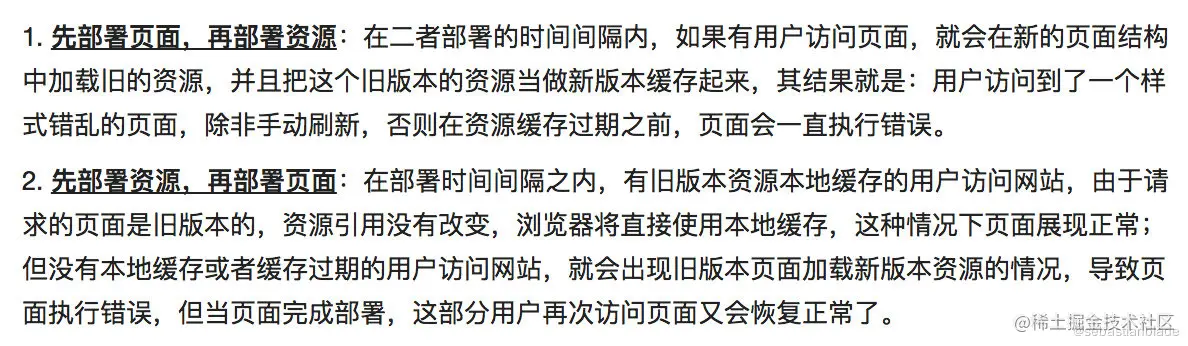 仅更新前端页面的前提下,文件名带有hash值还可以实现用户无感知发版:系统更新时,只需要将打包之后的文件除index.html以外的文件(js/css/img),全部上传到服务器网站目录,未修改文件(即重名文件)直接跳过,有修改的文件由于文件的hash值不同会被上传,上传完毕我们再将index.html覆盖掉旧版就行。这段时间用户已请求旧版本index.html的无影响(不会出现文件404,因为新旧版本js/css同时存在),而新访问用户则请求的是新版index.html,访问旧页面用户刷新也会请求新版文件,并且无缓存影响,即对用户使用0影响。一段时间之后,我们只需要按文件生成时间对比一下删除旧文件即可。PS:替换前端文件不需要重启服务器。