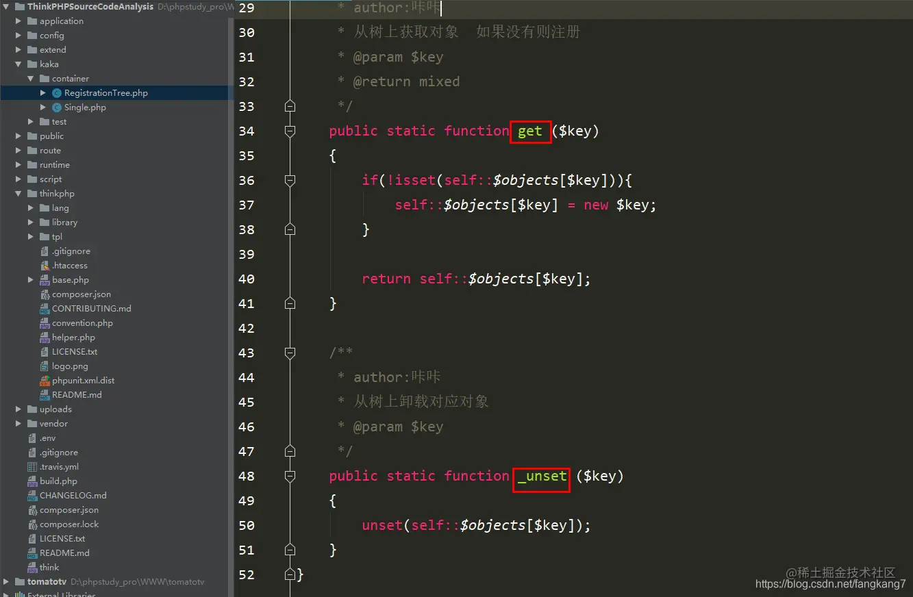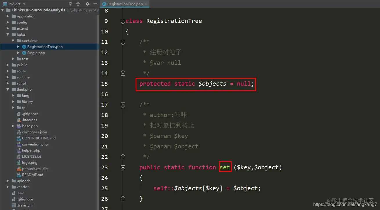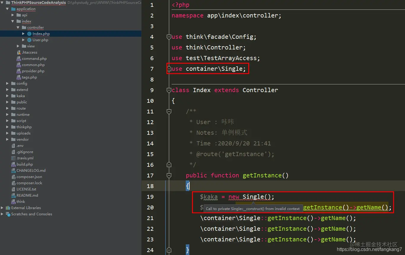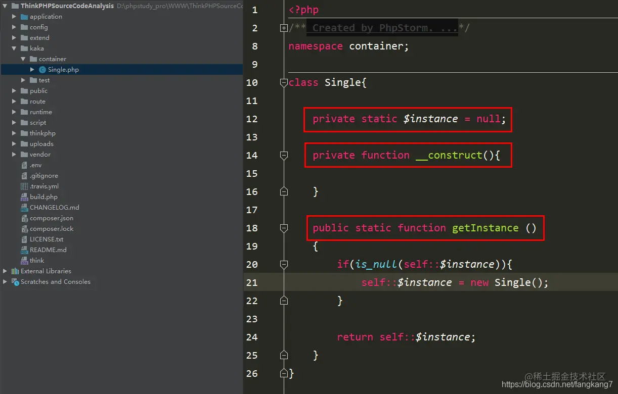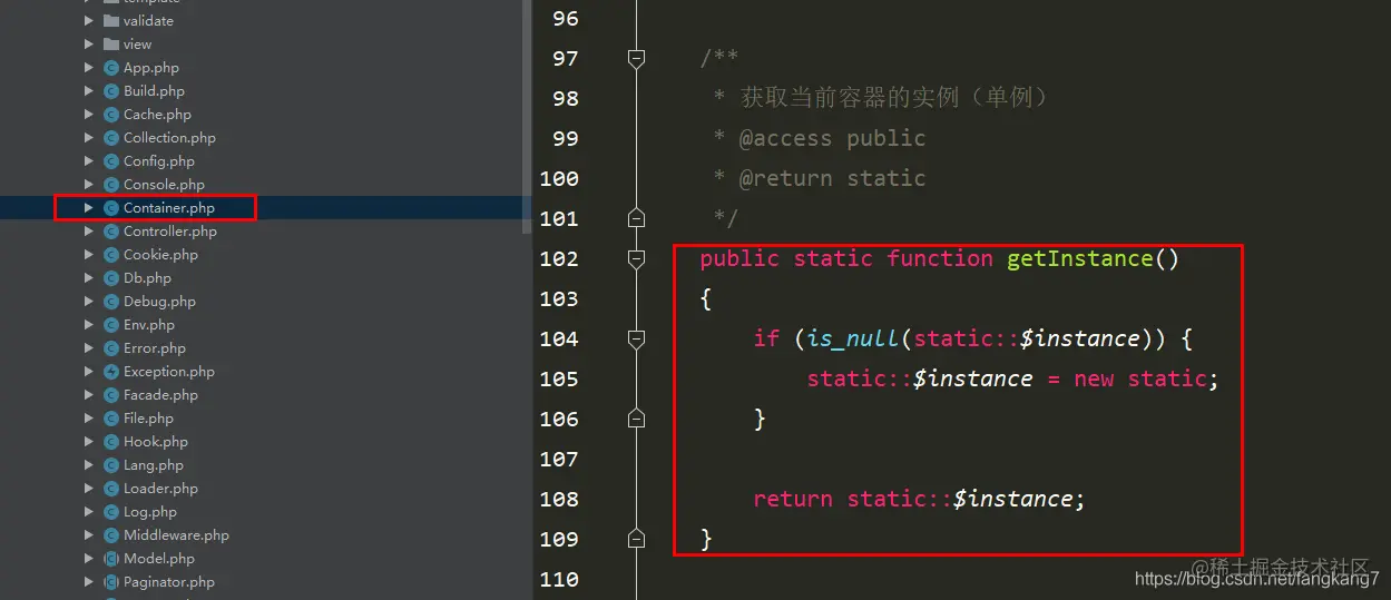 例如下图thinkphp/library/think/Container.php类中就存在一个获取当前容器的实例。