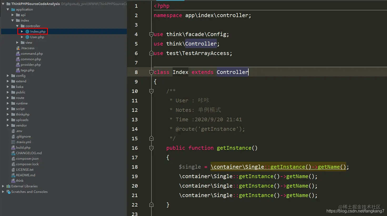 还是在index控制器中做测试,为了证实其类只被实例化过一次,调用了其四次