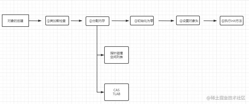 当我们new一个对象的时候,jvm先检查指令的参数能否在常量池中定位到这个类的引用符号引用。如果有,则证明这个对象被加载过,直接跳到init。然后检查这个符号引用代表的类是否已经被加载、解析和初始化过。没有才进行相应的类加载过程。