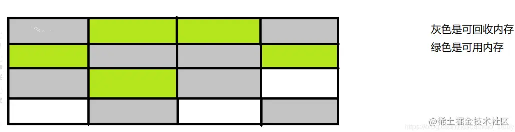 那垃圾收集完之后就会像上图一样,剩余的空间不规整。就需要维护一个空闲列表,记录下那几块内存是可用的。分配内存的时候就去空闲列表找对应大小的内存就行了。