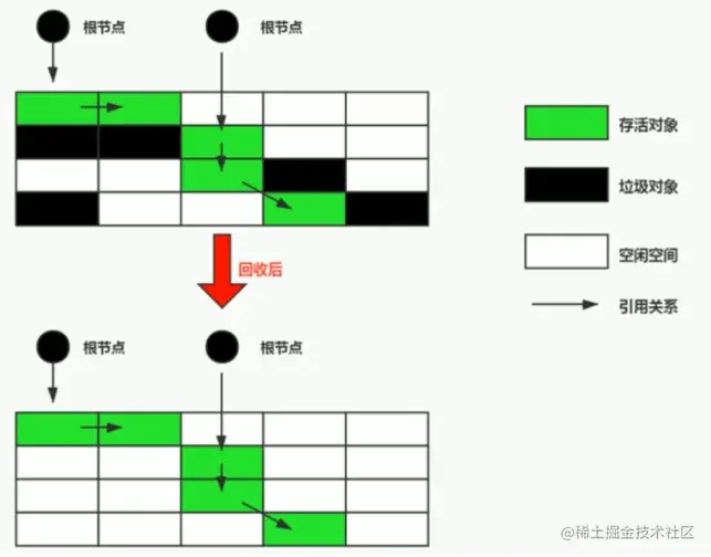 上面是清理前后的内存对比图。由于垃圾回收完之后内存是整洁有序的。所以再次为对象分配内存时可以接着依序分配就好了,这个时候使用的就是指针碰撞。