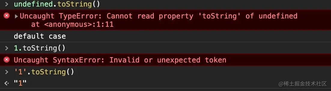 这里'1'.toString() 却可以使用,为什么呢?其实在这种情况下,'1' 已经不是原始类型了,而是被强制转换成了 String 类型也就是对象类型,所以可以调用 toString 函数。 除了会在必要的情况下强转类型以外,原始类型还有一些坑。