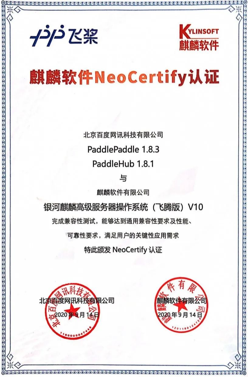 (图:百度飞桨和麒麟软件完成互认证)