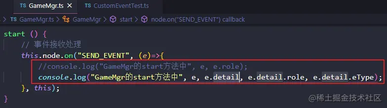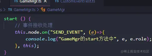 注意:此时,如果我们要在其父节点Canvas节点下也能接收到此SEND_EVENT事件,我们会设想,在GameMgr.ts中增加如下代码,但是事实上,运行后,GameMgr.ts的如下代码没有接收到派发事件。