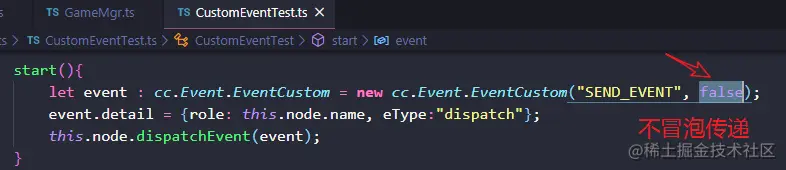 注意:若将CustomEventTest.ts中的事件冒泡属性改为false,如下,表示不冒泡传递,则其父节点Canvas将收不到派发的事件。