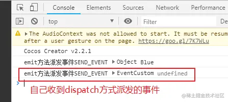 运行结果如下(说明依然只有Blue自己这个节点接收到了emit派发的事件SEND_EVENT):