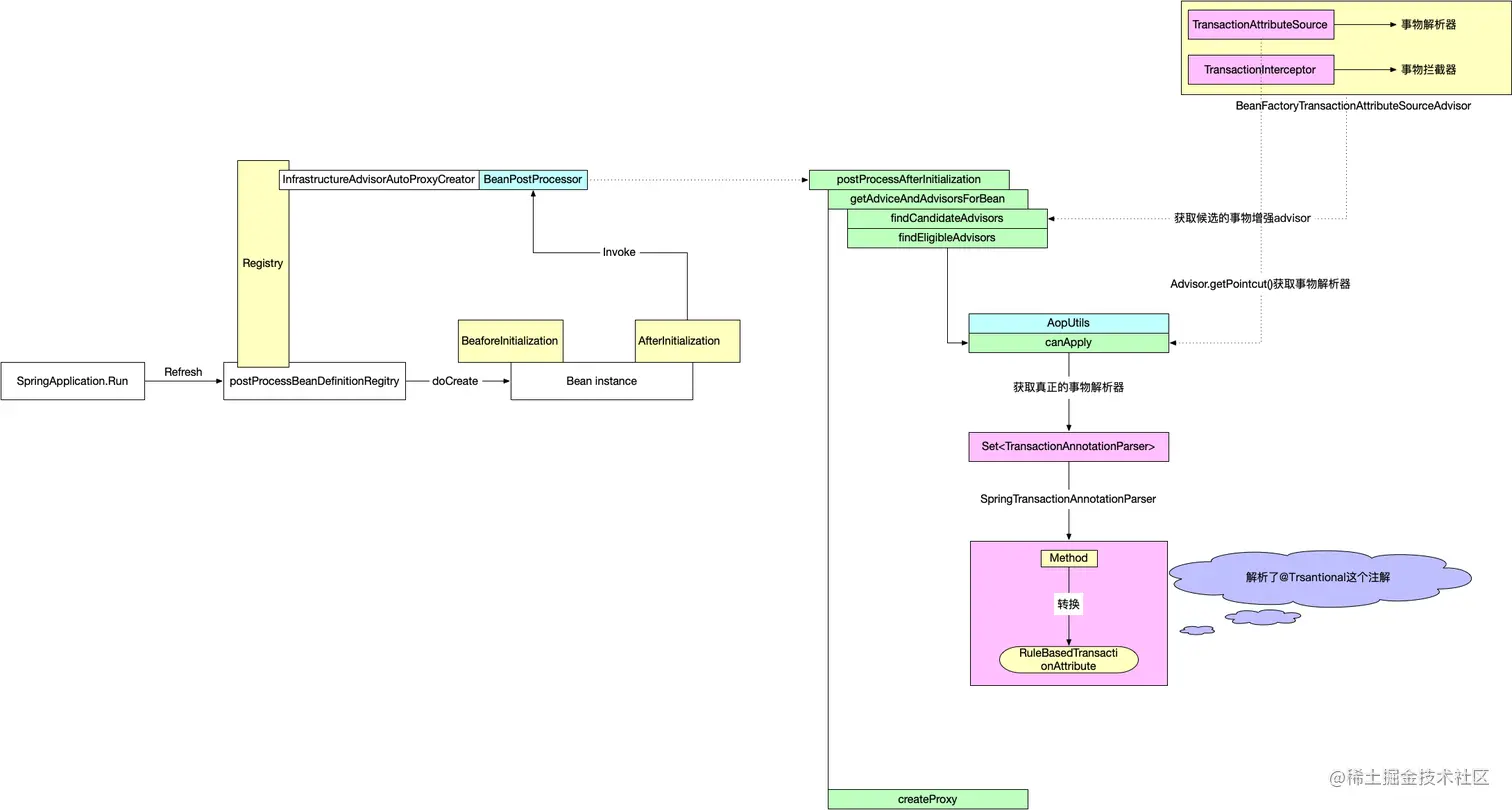 在初始化ProxyTransactionManagementConfiguration的时候设置了TransactionAttributeSource事物解析器和TransactionInterceptor事物拦截器两个组件。上文提到的InfrastructureAdvisorAutoProxyCreator将两个组件串联了起来。