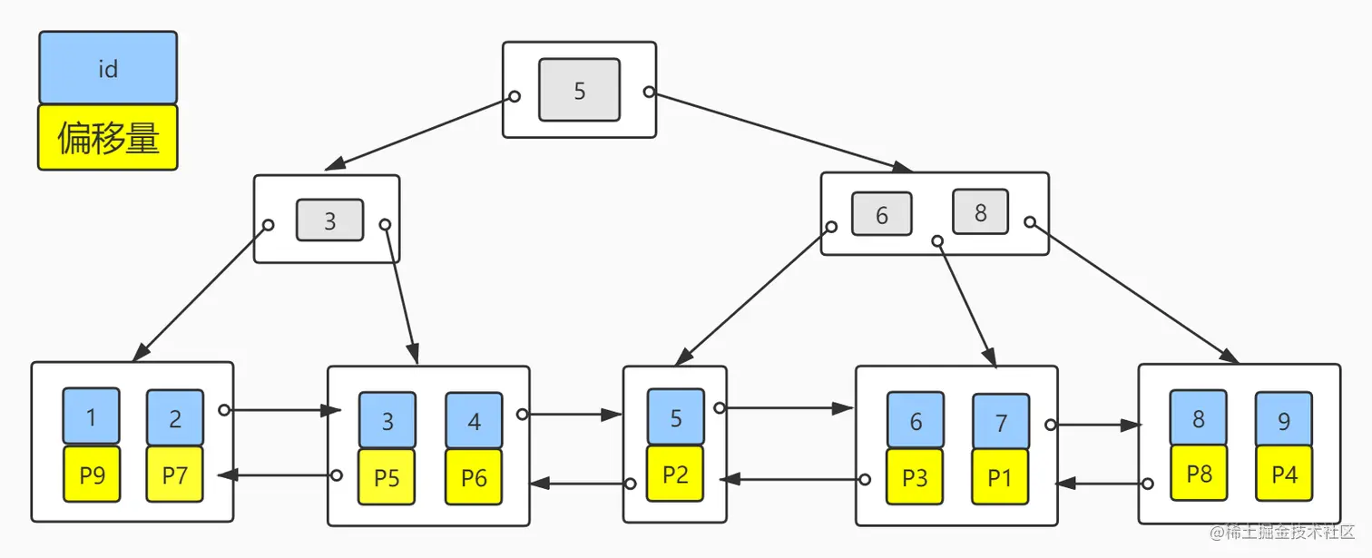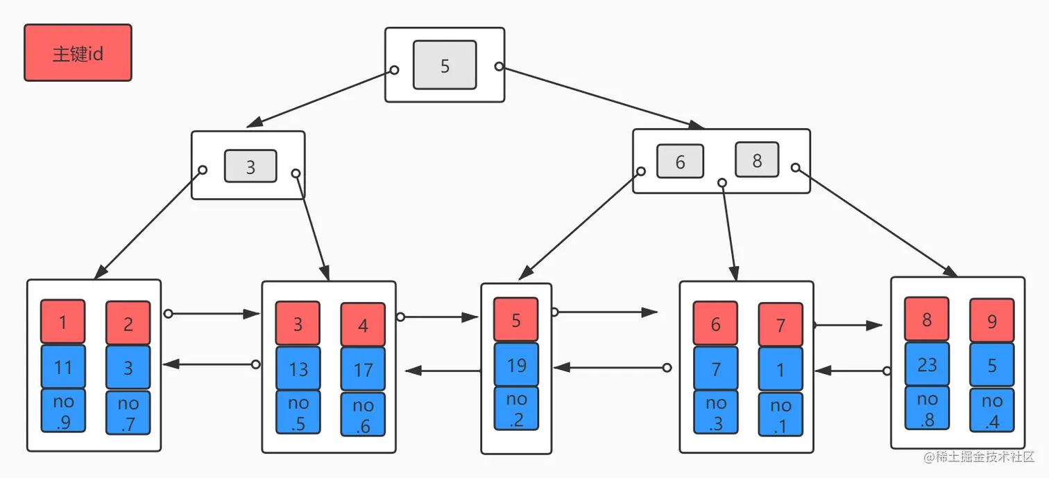 搞清楚了MyISAM的数据存储方式,再来看下主键索引的存储。我们假设每个磁盘块只能存储两个节点数据,MyISAM的主键分布如下图: