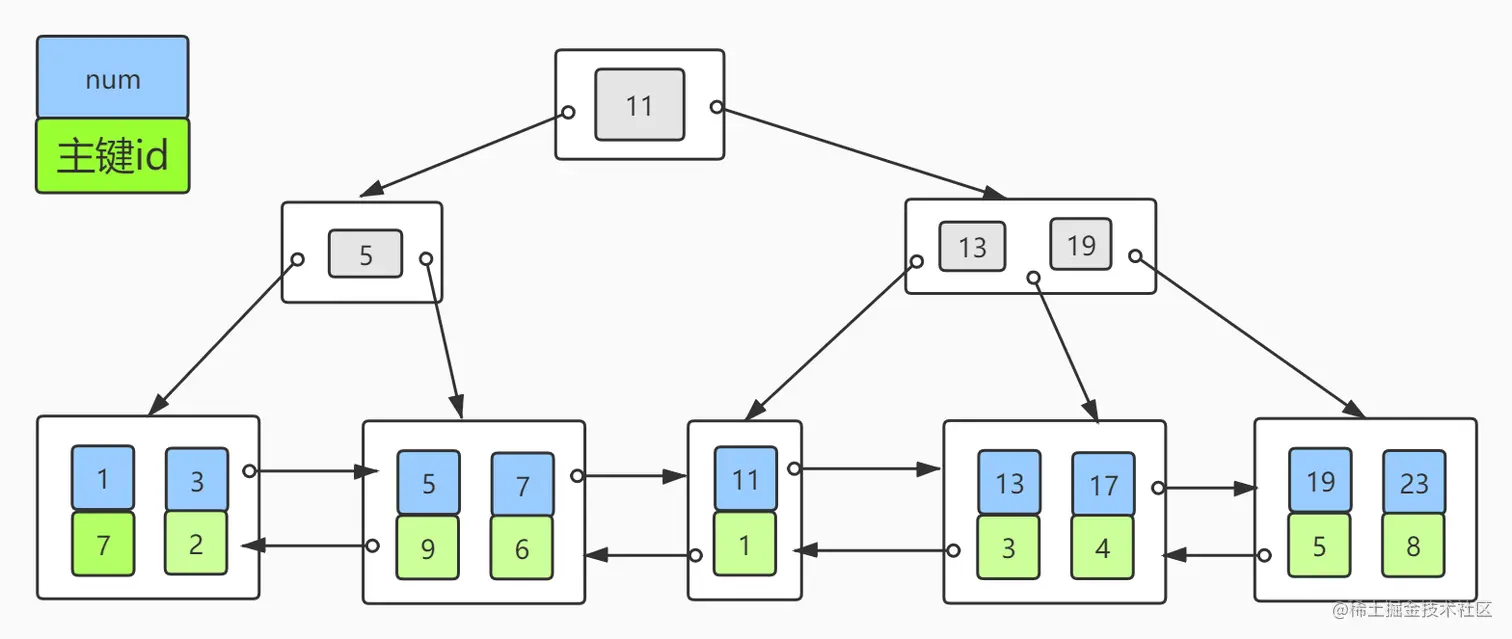 二级索引子节点也只存储了索引列(num)和文件的偏移量(P),但可以看出num是有序的,这在范围查找(比如: