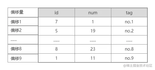 MyISAM按照数据插入的顺序存储在磁盘上,我们假设第一行数据在数据库表文件中的偏移位置是1,以此类推。 如下图