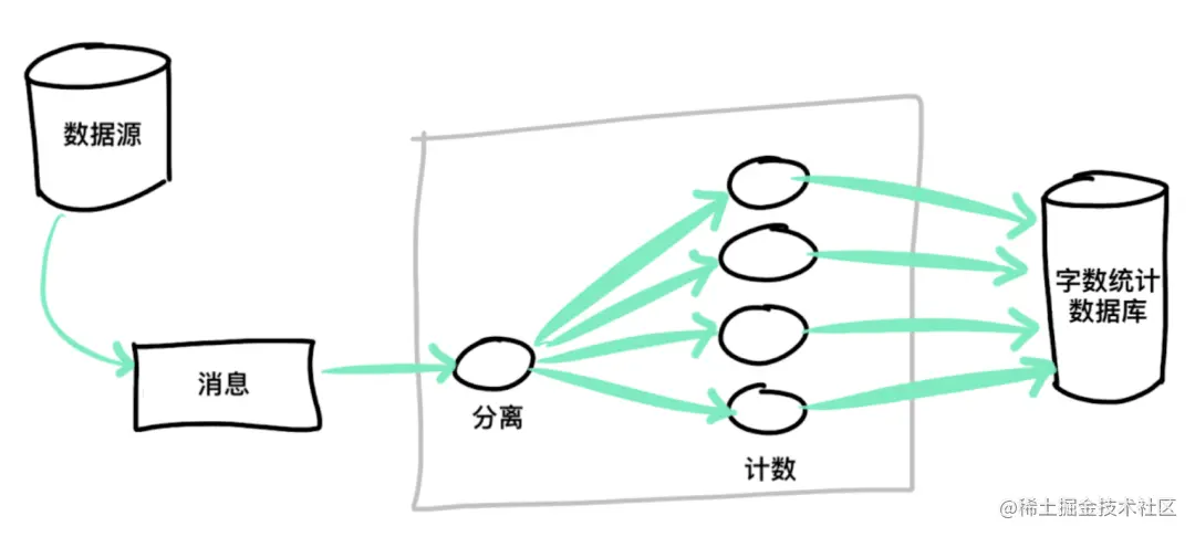 如上图所示,首先来自数据源(如 Twitter Firehose)的数据被推送到消息系统,然后消息系统将这些数据传输到 SPE 并由 SPE 处理这些数据(即字数统计)。最后,将数据处理结果存储在字数统计数据库中,也可以进一步用作分析。