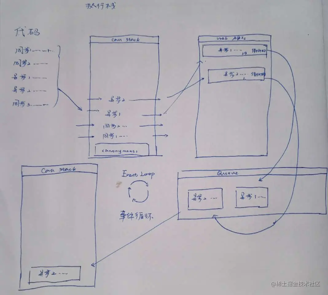 异步调用在JS中的实现过程,以及它的基本原理:首先加载整体代码到执行环境中,并在调用栈中压入一个匿名函数调用,然后依次执行每行代码。遇到同步代码会进行压栈-执行-弹栈这样的运行流程;遇到异步代码时也会先进行压栈,然后在内部API为这个异步操作开启一个倒计时器。这个倒计时器是单独工作的,并不会收到当前的JS线程影响。开启倒计时后,对这个异步程序来讲,它的调用已经完成了。它也会从执行栈中弹出并执行后面的任务,调用栈所有的任务执行完毕以后会被清空,这时事件循环Event Loop就会被启动进行工作。事件循环Event Loop它其实只做一件事,就是负责监听调用栈 Call Stack 和消息队列 Queue。一旦调用栈中所有的任务都结束了,事件循环就会从消息队列中取出第一个回调函数,然后压入到调用栈中。我们在执行调用栈的同时,倒计时器也在同时执行并在倒计时结束后进入消息队列。一旦消息队列发生了变化,事件循环就会监听到。然后就会把消息队列当中的任务,从前到后压入调用栈中执行。对于调用栈来说此时等于开启了新一轮的调用,执行过程和原来一样。如果这个过程有遇到异步调用,它也是相同的情况。先会把它放入到API环境里面去单独执行,再往后就是按照这个流程执行。直到我们的调用栈和消息队列中都没有要执行的任务,整体的代码就结束了。如果说我们的调用栈是一个正在执行的工作表,消息队列就是一个待办的工作表。而JS执行引擎就是一个先去做完调用栈当中所有的任务,然后在通过事件循环从消息队列当中再取一个任务过来继续执行,以此类推整个过程,我们随时都可以往消息队列当中再去放入一些任务。这些任务在消息队列当中,会排队等待事件循环。