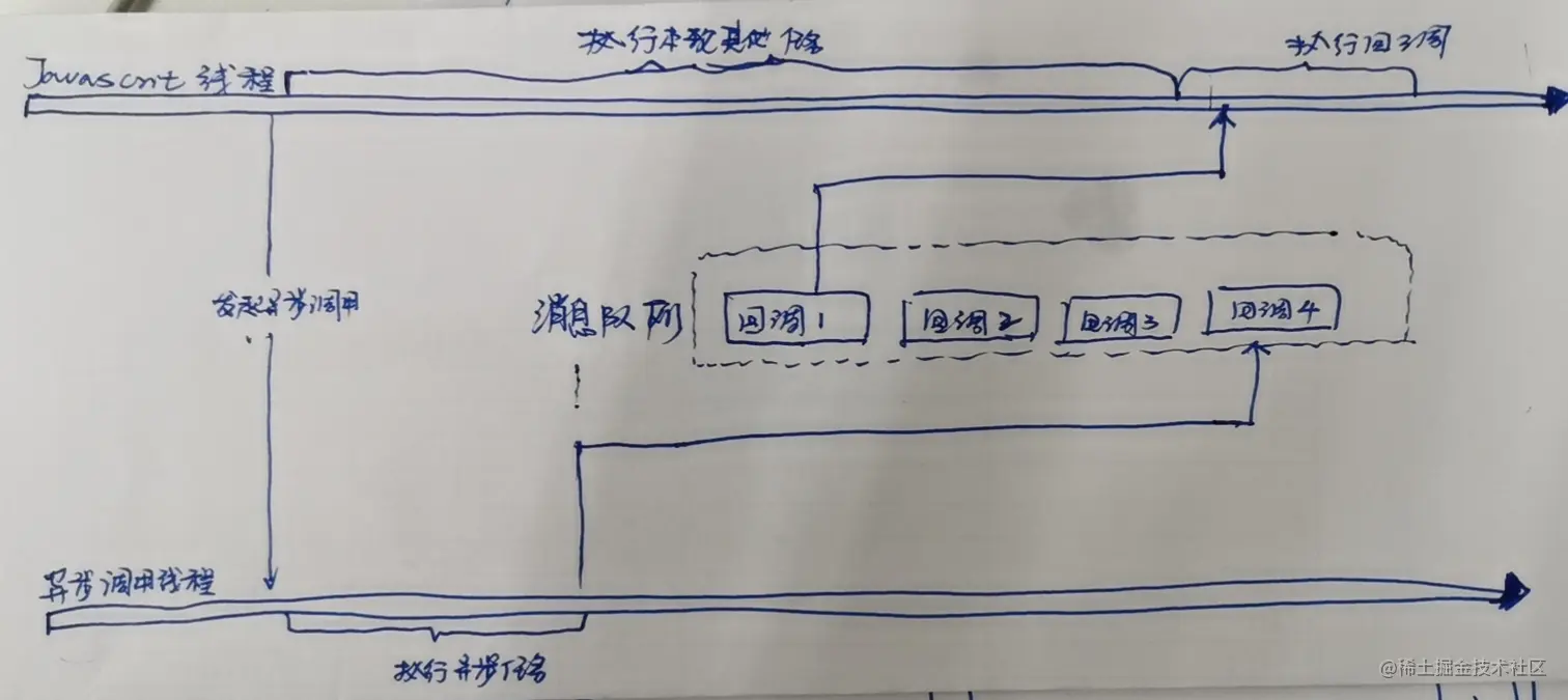 在JS当中JS线程在某一个时刻发起一个异步调用,然后它紧接着继续往后执行其他的任务,此时异步线程会单独去执行这个异步任务。然后在执行完这个任务过后,会将这个任务的回调放入到消息队列。JS主线程完成所有的任务后,会依次调用执行我们消息队列当中的任务。
