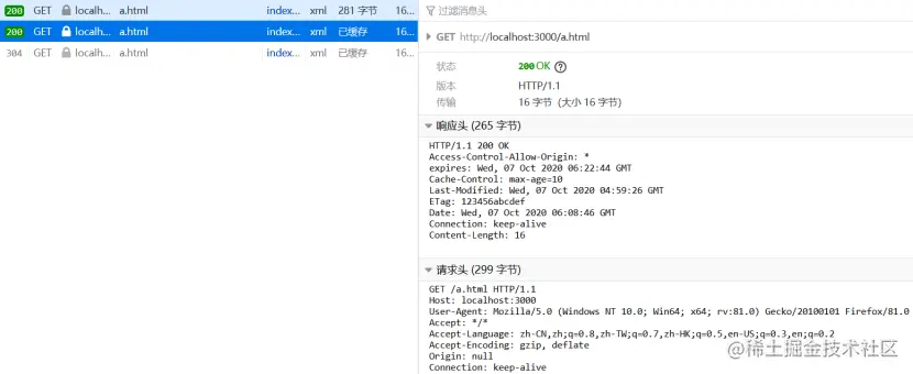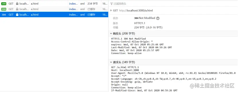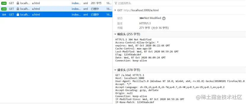 第三次访问时,10秒已经过去,缓存失效。浏览器向服务器发起的请求中携带了If-Modified-Since字段和If-None-Match字段来检验缓存的新鲜度,ETag的优先级大于Last-Modified。同样因为是简单模拟,所以ETag的值是随便赋值的字符串,然后服务端返回304状态码