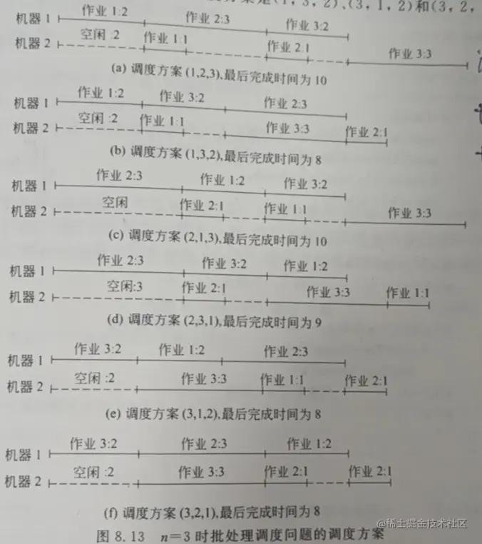 例如,有3个作业{1,2,3},这3个作业在机器1上所需的处理时间为(2,3,2),在机器2上所需的处理时间为(1,1,3),则这3个作业存在6种可能的调度方案:(1,2,3)、(1,3,2)、(2,1,3)、(2,3,1)、(3,1,2)、(3,2,1),相应的完成时间为10,8,10,9,8,8,如下图所示。显然,最佳调度方案是(1,3,2)、(3,1,2),其完成时间为8。