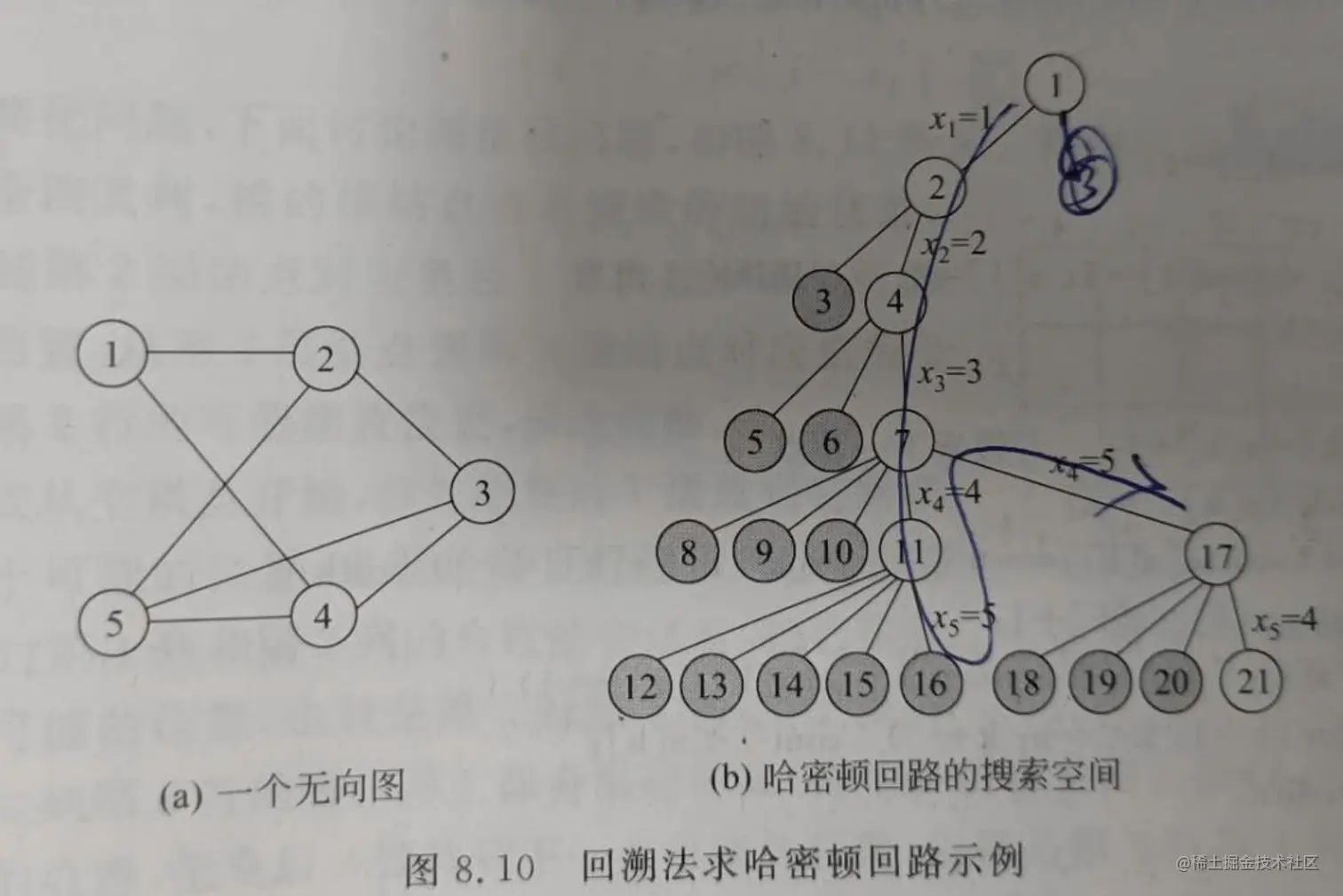 下图(a)所示是一个无向图,在解空间树中从根结点1开始搜索。首先将x1值为1,到达结点2,表示哈密顿回路从顶点1开始。然后将x2置为1,到达结点3,但顶点1重复访问,搜索节点3的兄弟子树,将x2置为2,构成哈密顿回路的部分解(1,2),在经过节点5和节点6的失败尝试后,将x3置为3,将哈密顿回路的部分解扩展到(1,2,3),在经过节点8、节点9和节点10的失败尝试后,将x4置为4,将哈密顿回路的部分解扩展到(1,2,3,4),在经过节点12、节点13、节点14和节点15的失败的尝试后,将x5置为5,将哈密顿回路的部分解扩展到(1,2,3,4,5),但是在图(a)中从顶点5到顶点1没有边,引起回溯;将x4置为5,到达节点17,构成哈密顿回路的部分解(1,2,3,5),在经过节点18、19和20的失败的尝试后,将x5置为4,将哈密顿回路的部分解扩展到(1,2,3,5,4),而在图(a)中从顶点4到顶点1存在边,所以,找到了一条哈密顿回路(1,2,3,5,4,1),搜索过程结束。注意到,解空间树中共有243个节点,而回溯法只搜索了其中的21个节点后就找到了问题的解。在解空间树中的搜索构成如图(b)所示。