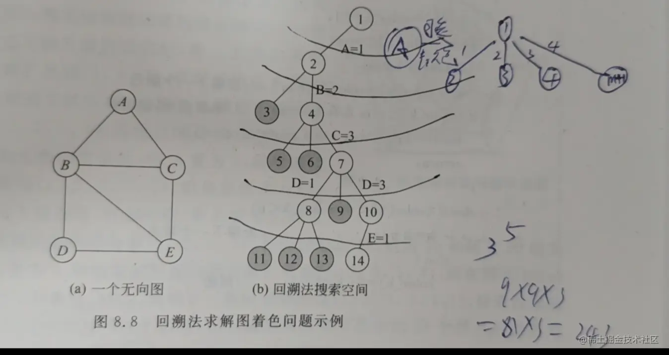 对于下图中求解三着色问题,在解空间树中,从根节点出发,搜索第一棵子树,即为顶点A着颜色1,再搜索节点2的第一棵子树,即为顶点B着颜色1,这导致一个不可行解,回溯到节点2,选择节点2的第二棵子树,即为顶点B着颜色2,在为顶点C着色时,经过着颜色1和2的失败尝试后,选择节点4的第三棵子树,即为顶点C着颜色3,在节点7选择第一颗子树,就为顶点D着颜色1,但是在为顶点E着色时,顶点E无论着3种颜色的哪一种均发生冲突,于是导致回溯,在节点7选择第二棵子树也会发生冲突,于是,选择节点7的第三棵子树,即顶点D着颜色3,在节点10选择第一棵子树,即为顶点E着颜色1,得到了一个解(1,2,3,3,1)。注意到,解空间树中共有243个节点,而回溯法只搜索了其中的14个节点后就找到了问题的解。
