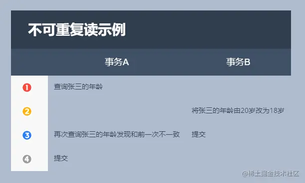 不可重复读是事务A两次查询期间事务B修改了数据,导致事务A两次读取的数据不一致。