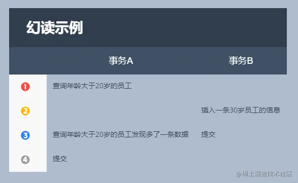 幻读是指事务A查询一次数据后,事务B增加或减少了几条数据,事务A再次查询发现和之前查到的数据条数不一致,就好像出现了幻觉一样。