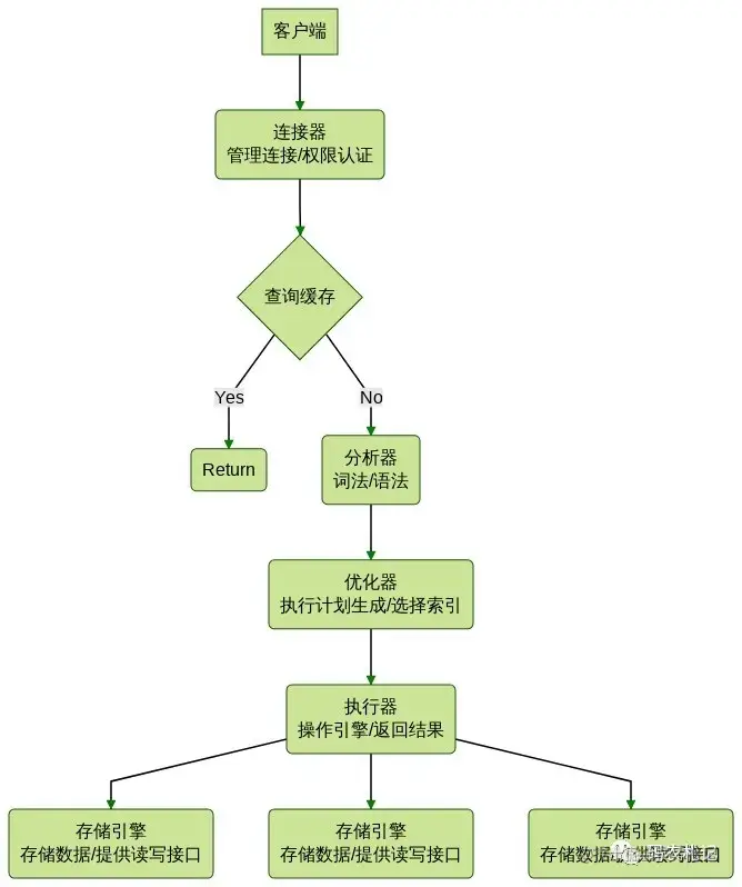 **查询缓存:** 执行查询语句的时候,会先查询缓存(MySQL 8.0 版本后移除,因为这个功能不太实用)。