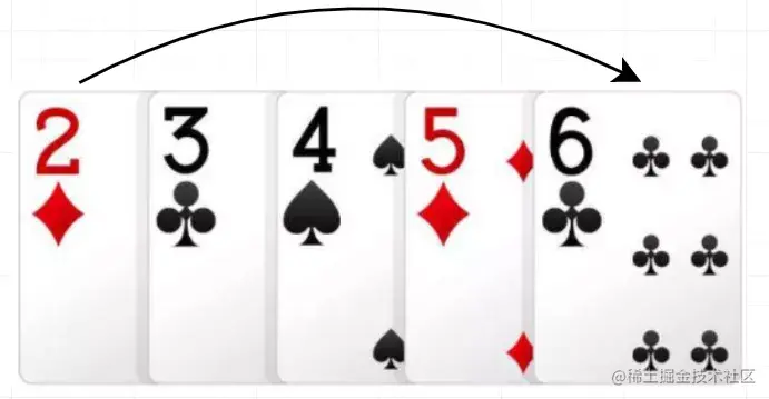 排序后,我们通过累积每两张牌之间的差值,来计算最小值和最大值中间的总差值。