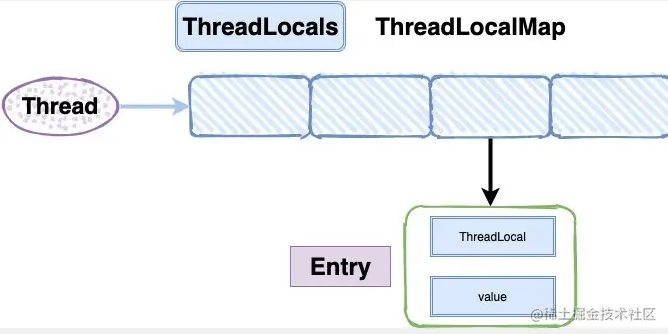 ThreadLocalMap是ThreadLocal的静态内部类 ,为每个Thread都维护了一个Entry类型的数组table(方便一个线程通过多个ThreadLocal实例对象关联多个值),里面定义了一个Entry来保存数据,而且还是继承的弱引用。在Entry内部使用ThreadLocal实例对象作为key,使用我们设置的value作为value来保存数据。采用开放地址法解决hash冲突