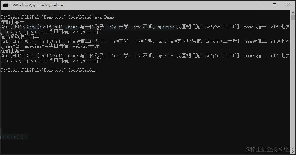 这就是为什么我们使用toString输出Cat类对象时成员变量里的内容也可以正常输出的原因。